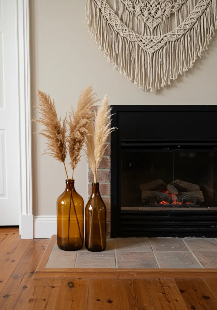 This relaxed, boho-style fireplace feels cozy yet carefree. The black frame and natural brick balance beautifully with the soft textures of the macramé wall hanging and amber glass vases. The pampas grass adds that feathery softness that instantly makes a space feel relaxed and airy.