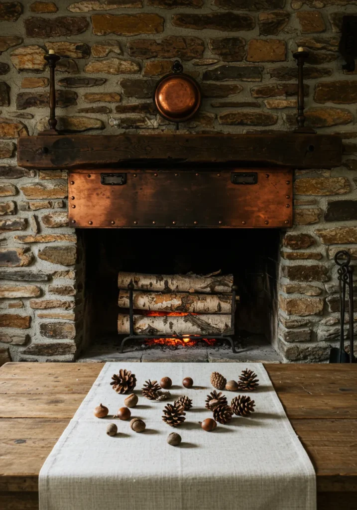 This rustic stone fireplace brings a warm, old-world feel that’s perfect for Thanksgiving gatherings. The mix of rough stone, rich wood, and aged copper creates a cozy setting that feels both grounded and sophisticated. Birch logs and scattered pinecones on the nearby table add an earthy touch that keeps everything feeling natural and homey.
