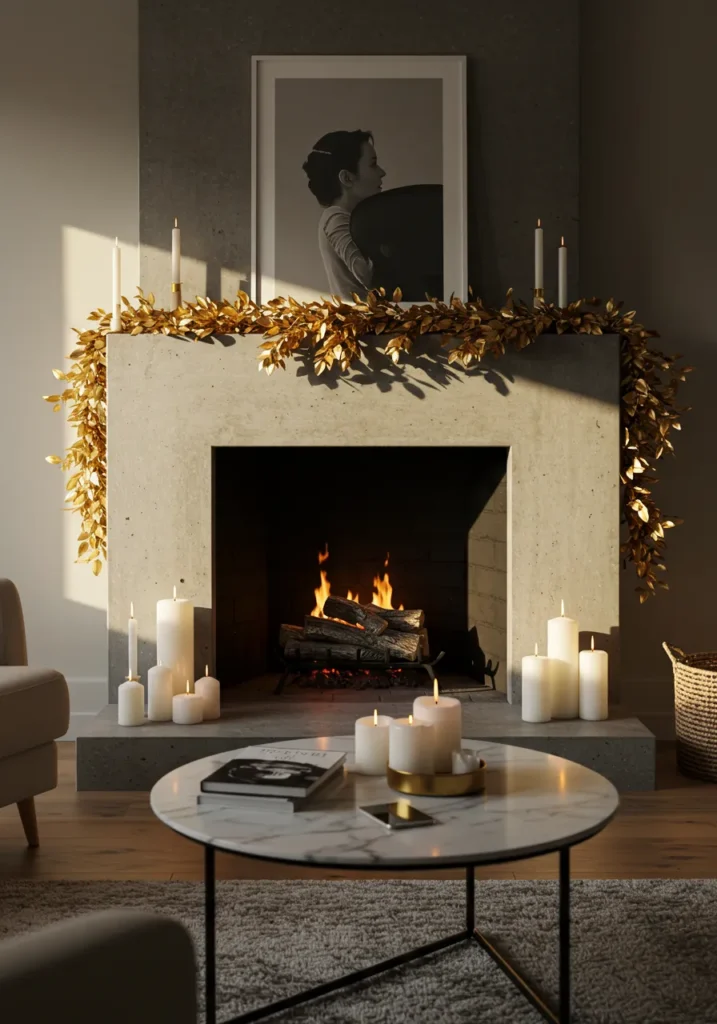 This sleek concrete fireplace proves that modern can still feel cozy. The clean lines pair beautifully with the golden garland draped across the mantel, catching the soft evening light. Clusters of white candles in different sizes warm up the cool stone and give the whole room a soft, glowing elegance.