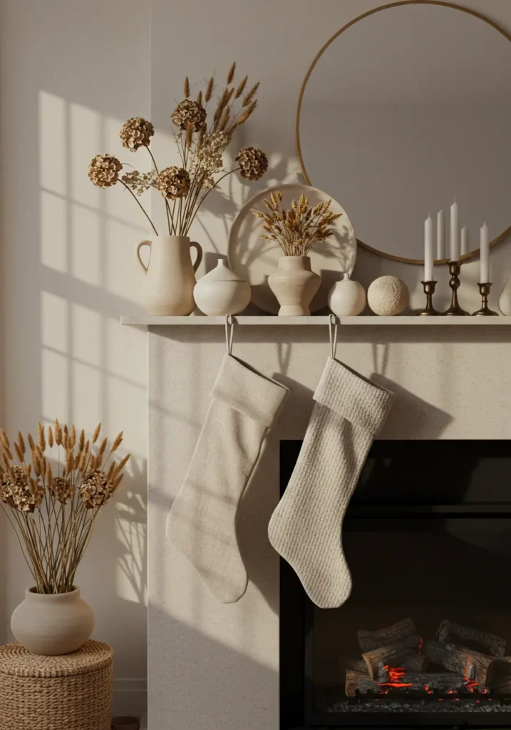 This creamy neutral fireplace creates an effortless, calming look that still feels festive. The round mirror and ceramic vases add soft curves, while the dried flowers and wheat stems bring gentle texture. The light from the window makes everything glow in shades of beige and gold, creating a scene that feels serene and perfectly balanced.