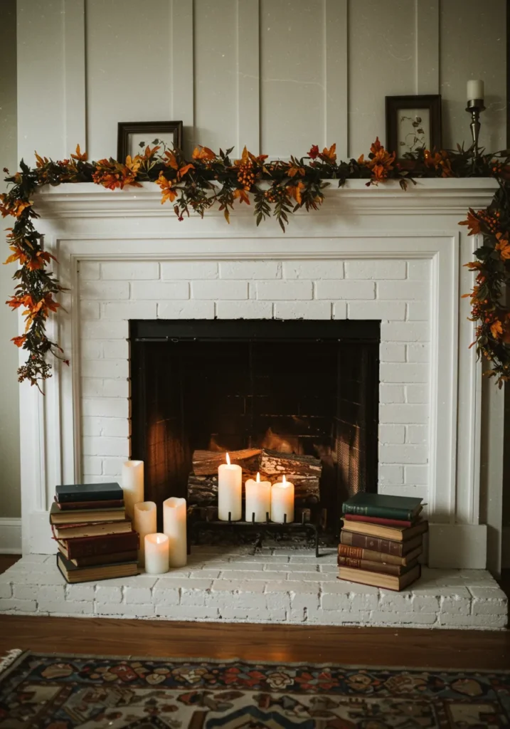 This cozy white brick fireplace combines classic charm with a touch of literary nostalgia. The autumn garland draped across the mantel adds rich color, while piles of vintage books and glowing candles bring instant warmth. The whole setup feels like the perfect mix of cozy cottage and timeless elegance.