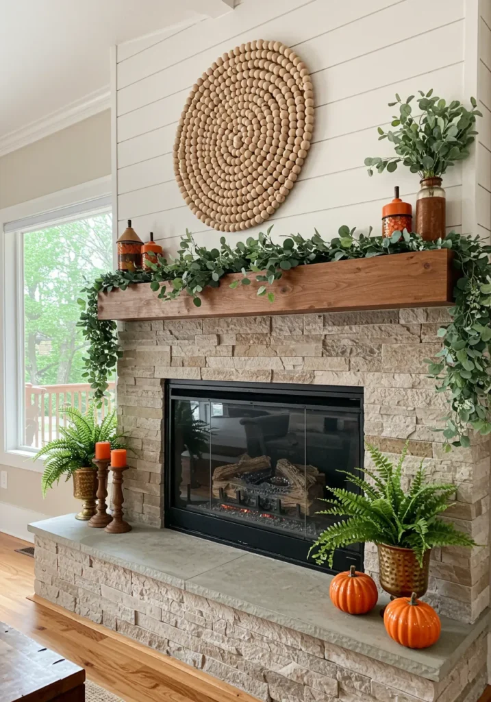 This stone fireplace hits that perfect balance between fresh and traditional. The wood mantel feels grounded and warm, while the eucalyptus garland and bright orange pumpkins add a pop of seasonal color. The textured stonework gives the space depth, and the mix of greenery and ferns keeps it feeling alive and full of energy.