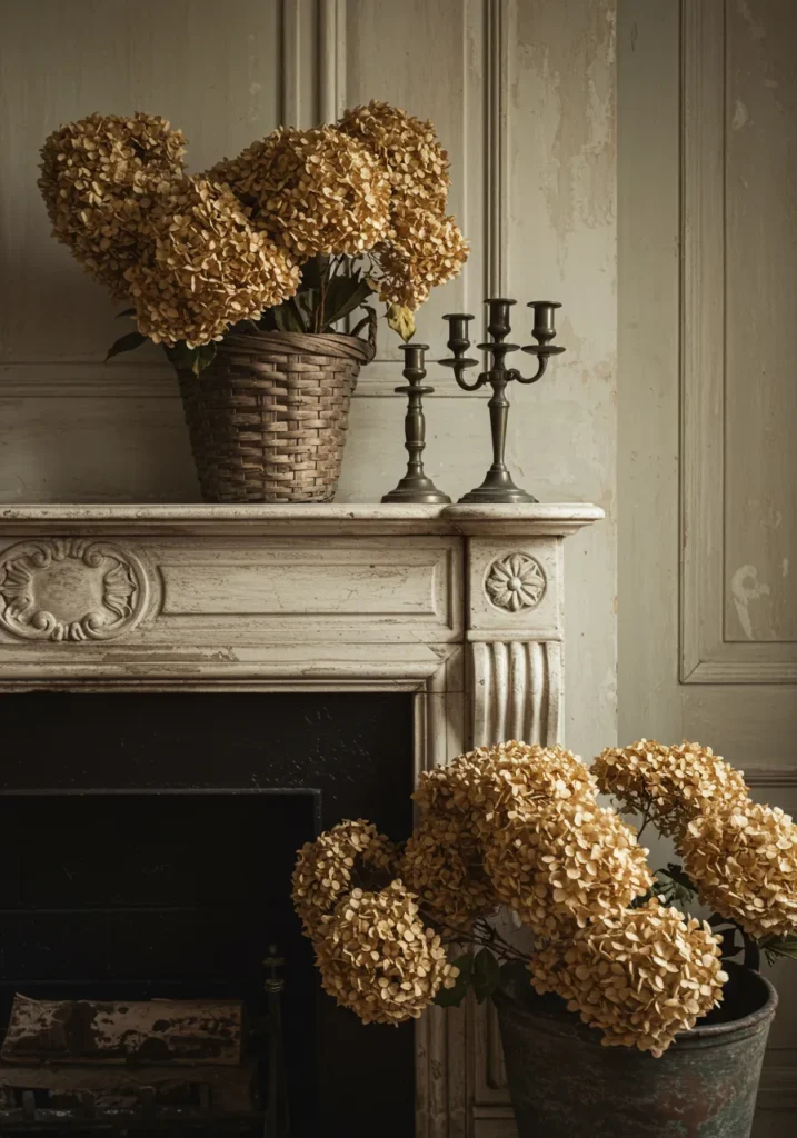 This charming fireplace has a romantic, vintage soul. The distressed white wood and carved detailing bring antique charm, while the dried hydrangeas add volume and rich autumn texture. Brass candlesticks tie it all together with a soft glimmer, creating a warm, nostalgic feel.