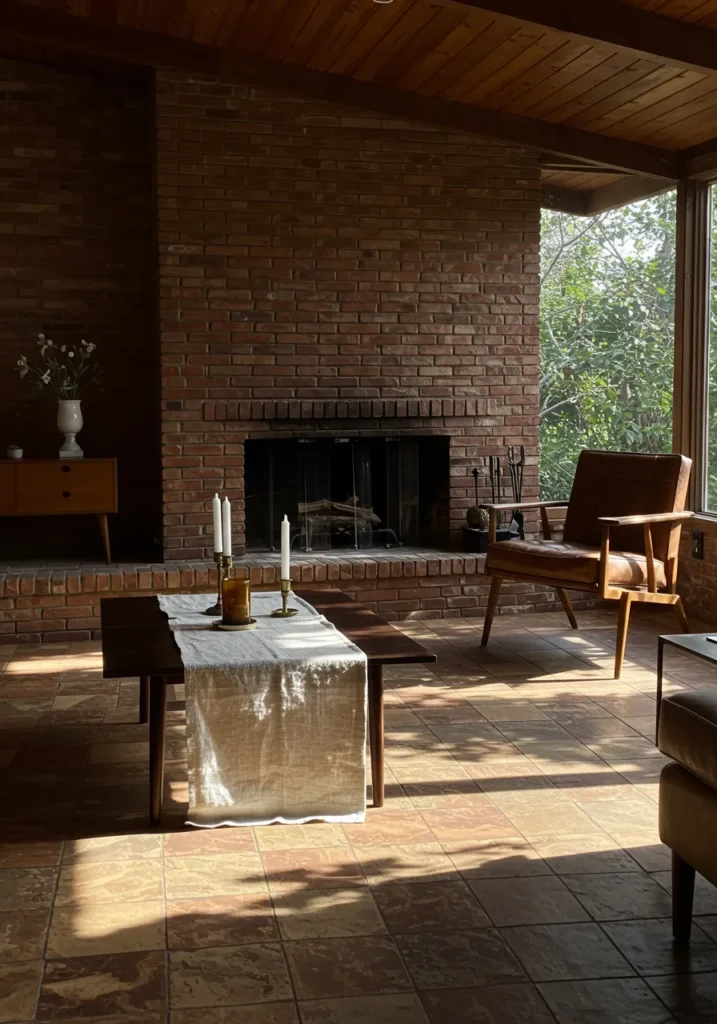 This midcentury living room feels both grounded and elegant, with its striking brick fireplace and warm wooden ceiling. A soft linen table runner sits gracefully on the coffee table, paired with brass candlesticks that glimmer in the afternoon light. The earthy tones from the brick and leather armchair blend beautifully with the sunlight streaming through the large window, creating a calm and timeless atmosphere.