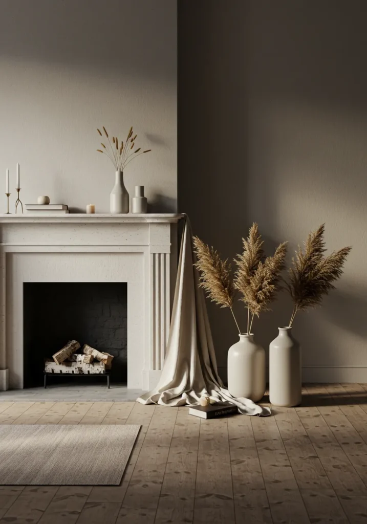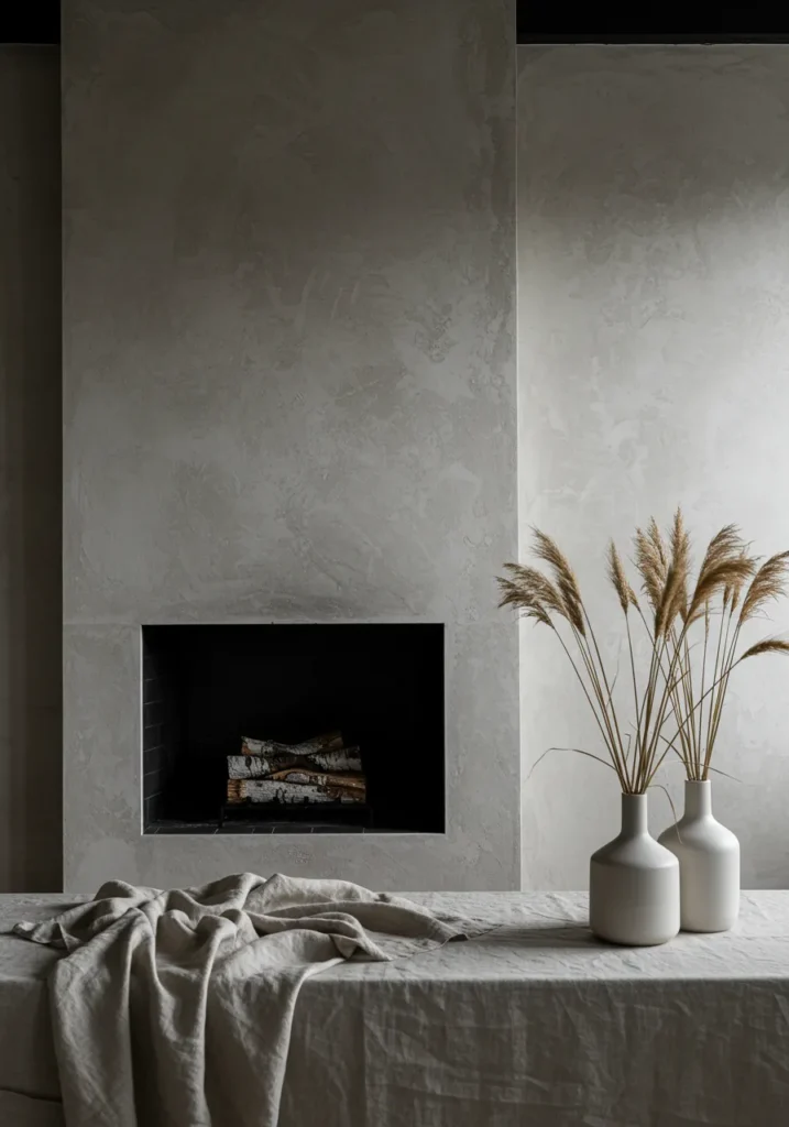 This modern gray fireplace is pure understated elegance. The smooth plaster finish gives a sleek, contemporary look, while the soft neutral tones keep it from feeling cold. Two ceramic vases with dried pampas grass add height and movement, and the linen throw spread across the hearth gives it a relaxed, effortless feel.