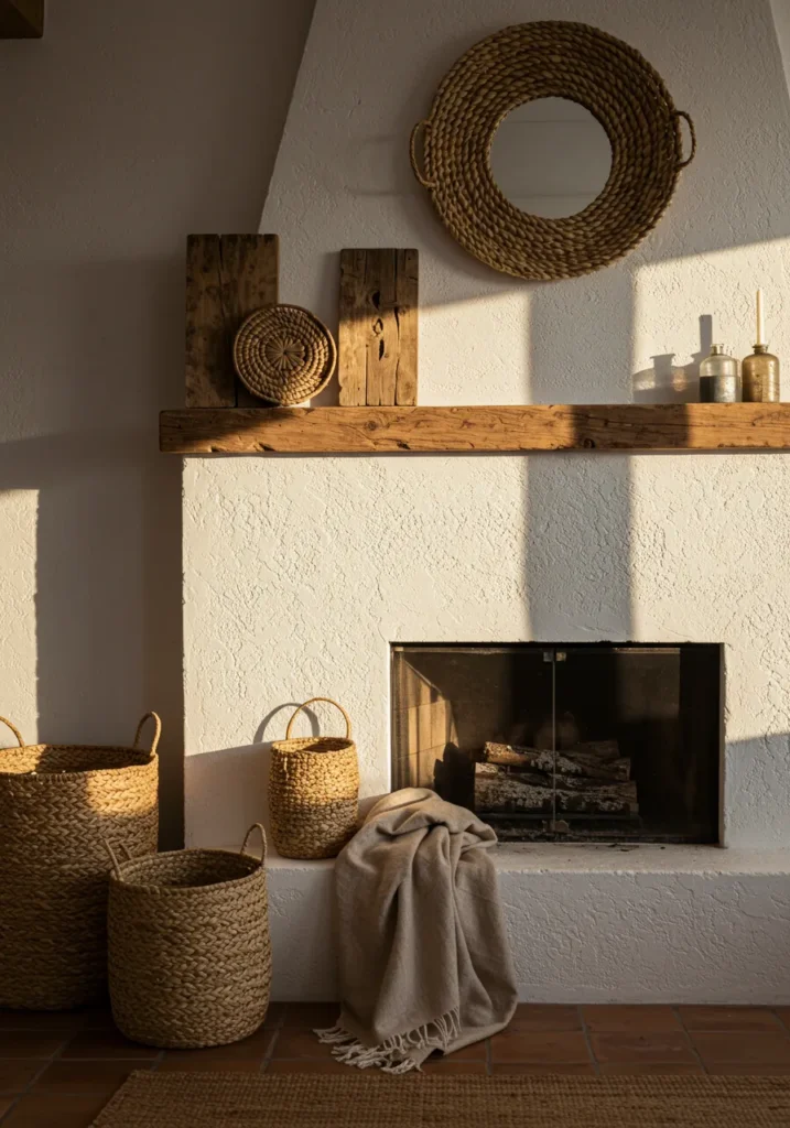 This rustic white fireplace with its textured stucco finish and reclaimed wooden mantel feels straight out of a sun-drenched Mediterranean home. The woven baskets, round mirror, and dried wood pieces bring natural texture and character to the scene, all glowing in soft golden light. Everything about this corner whispers comfort and authenticity.