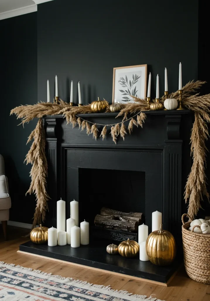 This fireplace steals the spotlight with its deep black mantel dressed in golden pumpkins, tall candles, and feathery pampas garlands. The matte black background makes every element pop, giving it a moody and luxurious autumn feel. The subtle play of textures—metallic, dried grass, and soft candlelight—creates a beautiful visual balance.