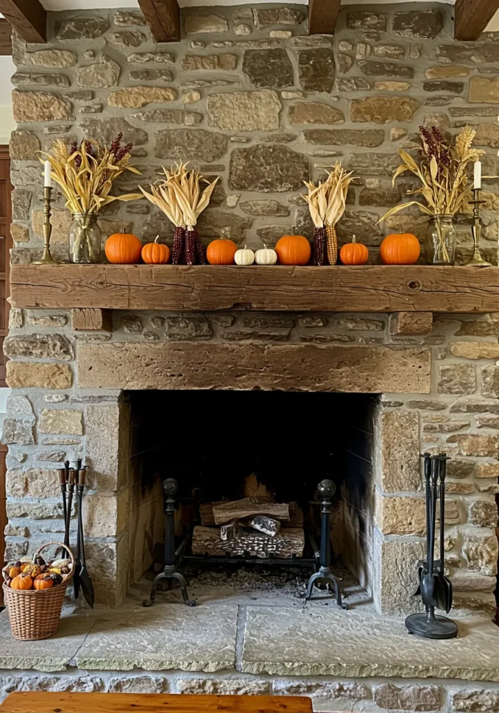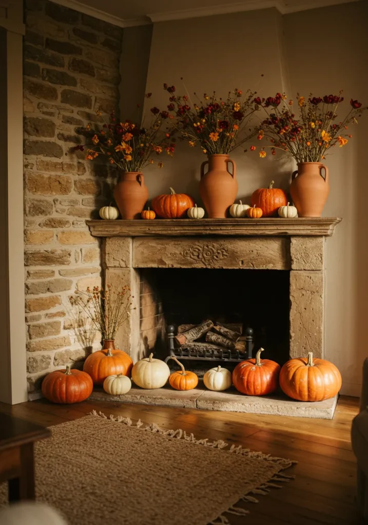 This charming stone fireplace feels straight from a cozy countryside cottage. The natural stonework pairs beautifully with terracotta vases filled with autumn blooms, while pumpkins in soft orange and creamy white fill the hearth with festive cheer. Every detail feels authentic and warm, like a nostalgic nod to classic harvest celebrations.