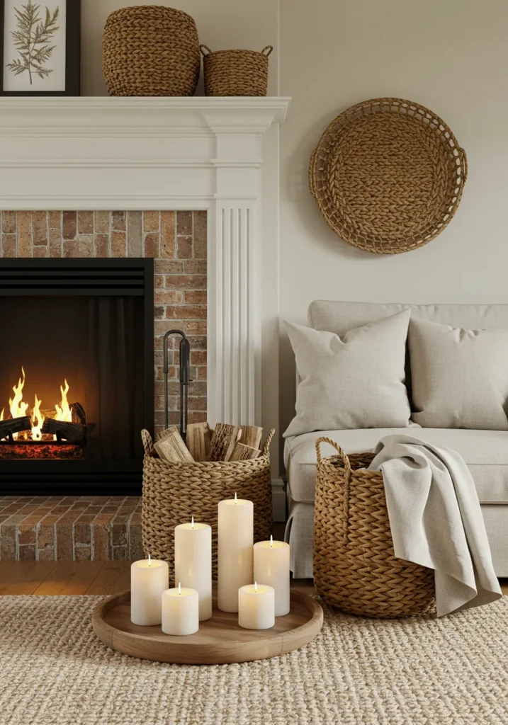 This serene fireplace setup proves that simplicity can be stunning. The woven baskets, linen cushions, and clusters of candles create a soft, inviting space filled with texture and light. The brick hearth adds just enough rustic character, while the neutral palette keeps the look calm and cohesive.