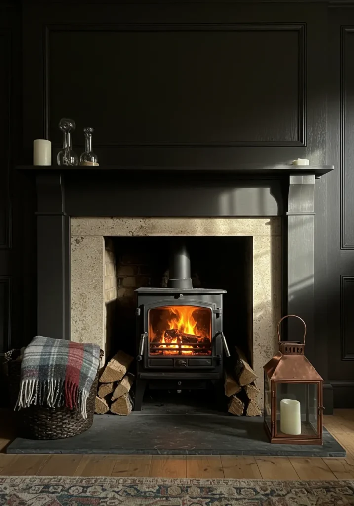 This bold design makes a statement with rich black paneling and a glowing fire framed in natural stone. The wood-burning stove brings that old-world comfort, while simple touches—a plaid blanket, glass decanters, and a copper lantern—add warmth and personality. The flicker of firelight against the dark walls creates a stunning contrast that feels both dramatic and deeply relaxing.