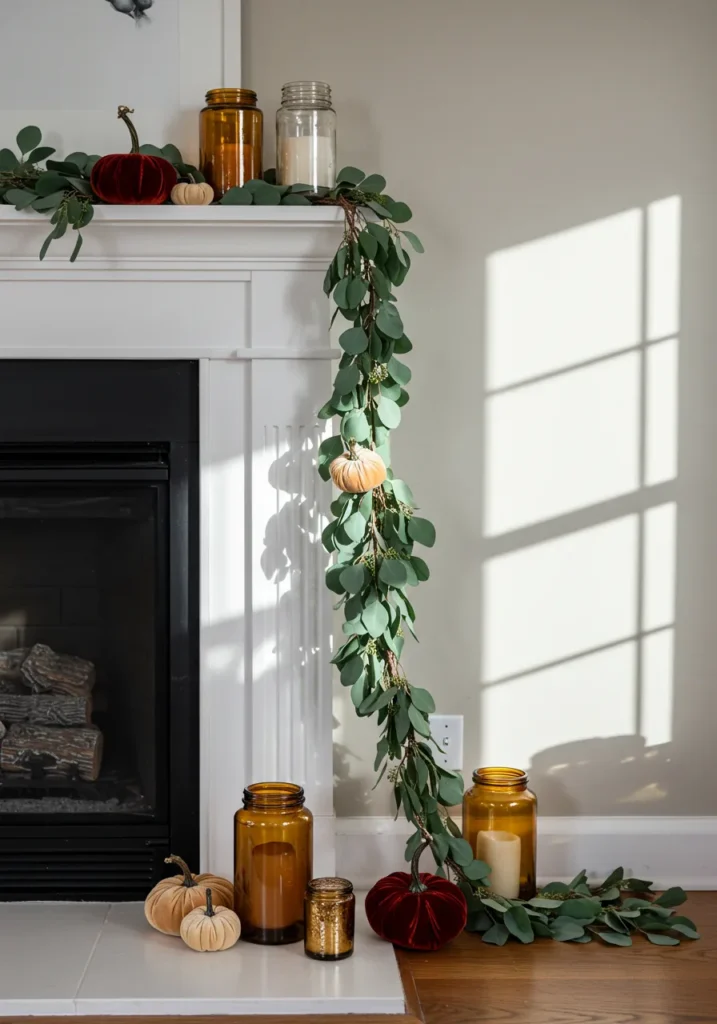 This soft, sunlit room celebrates texture in the prettiest way. A white fireplace is dressed with flowing eucalyptus garlands, amber jars, and tiny pumpkins in velvet and cream. The light streaming through the window makes every color pop just a little more, while the greenery keeps the look fresh and organic. It’s proof that simple details can completely transform a space.