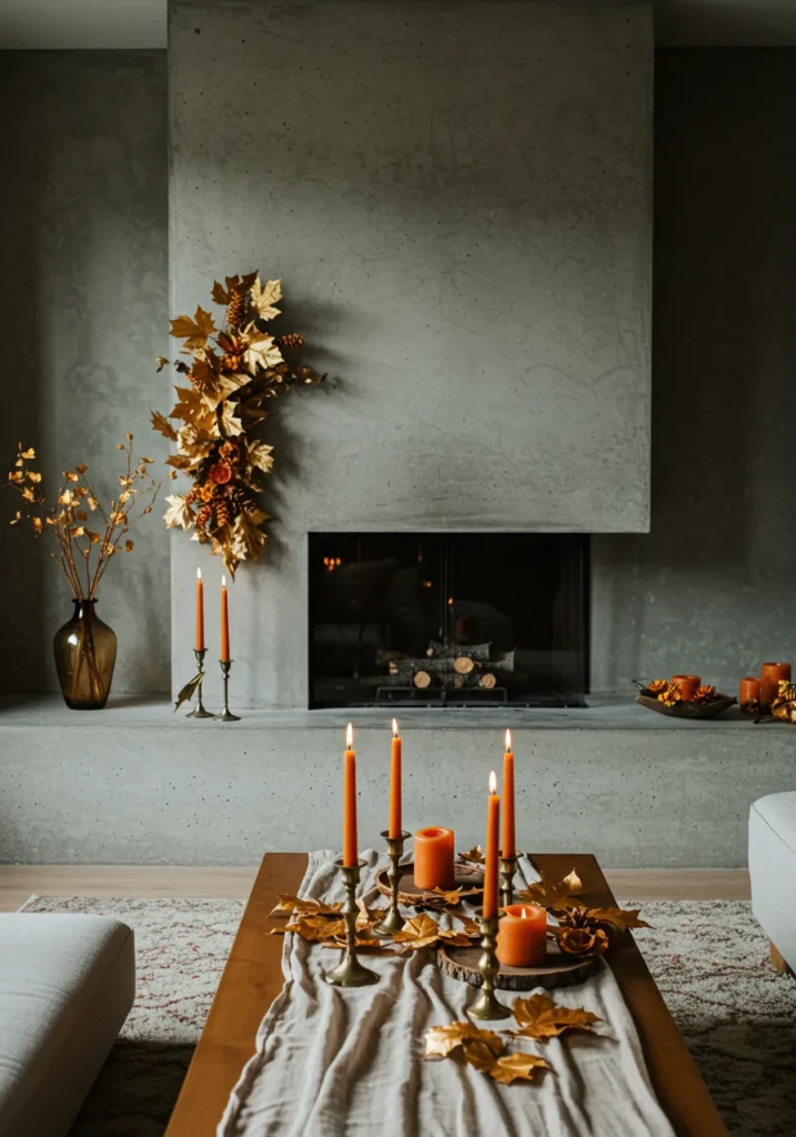 This sleek gray fireplace brings a modern twist to Thanksgiving warmth. A few key pieces—burnt orange candles, golden leaves, and a statement floral arrangement—add just the right amount of seasonal color without clutter. The clean lines and concrete finish keep everything polished, while the soft candlelight adds that cozy glow every fall space needs.