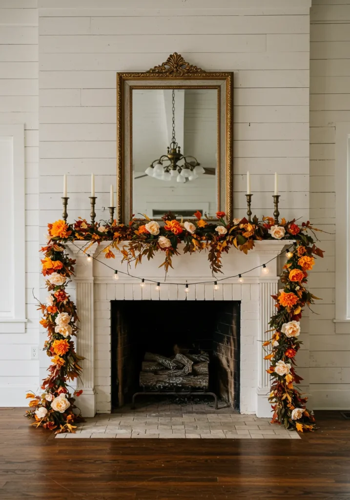 This classic white fireplace feels like a picture-perfect Thanksgiving moment. The shiplap wall and gold-framed mirror bring vintage charm, while the garland bursting with orange, ivory, and deep red blooms adds warmth and cheer. The tiny string lights woven through the flowers give the space a magical evening glow. Brass candlesticks complete the look, adding height and a soft, romantic touch.