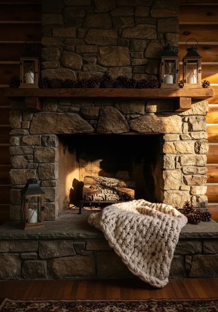 This cozy stone fireplace feels like a warm hug after a walk through the woods. The natural rock, chunky mantel, and wood accents create a rustic cabin atmosphere. Pinecones and lanterns bring in that woodland magic, and the chunky knit blanket casually draped in front practically invites you to curl up and get comfortable.