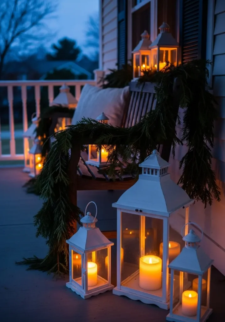 White lanterns glowing along a porch lined with evergreens create the dreamiest winter scene. The warm candlelight contrasts beautifully against the cool night air, giving off that gentle, comforting glow that makes guests feel instantly welcome.