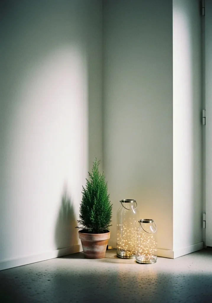 This tiny corner proves that less can truly be more. A small potted evergreen sits beside two glass lanterns filled with fairy lights, adding just the right touch of festive sparkle without overwhelming the space.