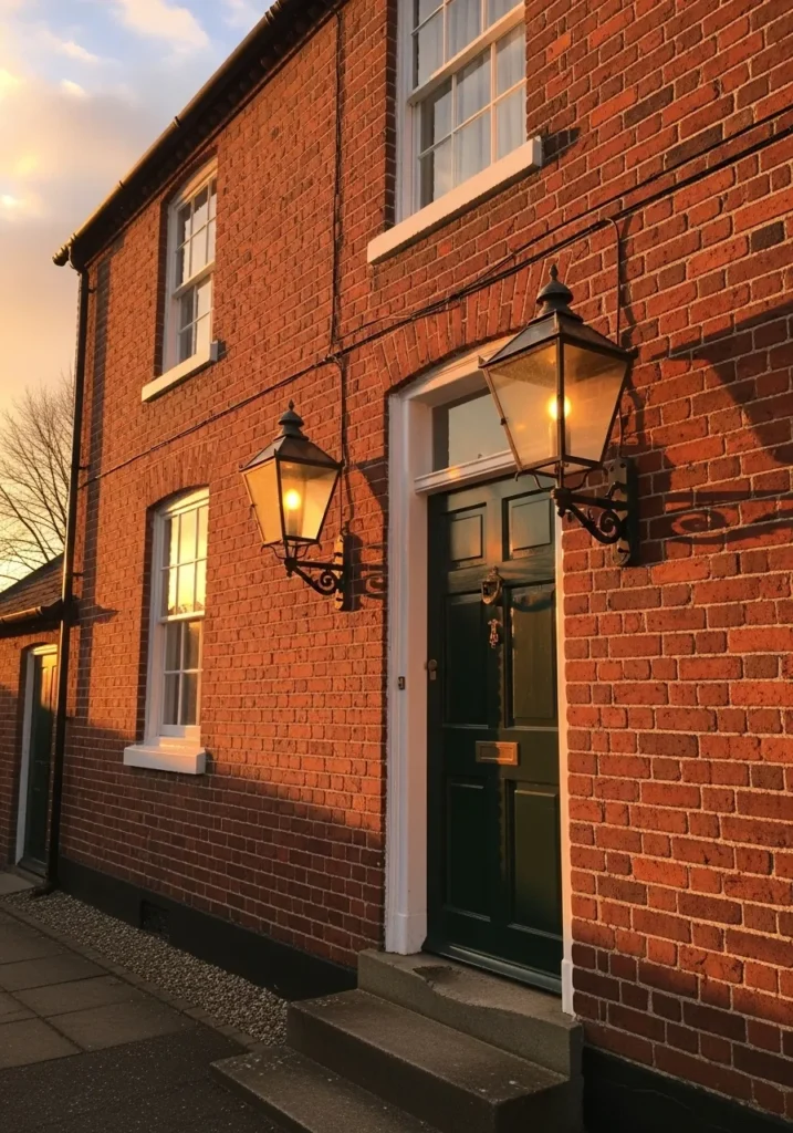 The soft glow of lanterns mounted beside a green front door adds the perfect golden light to this classic red-brick home. It’s a timeless setup that feels warm and welcoming even before you walk inside.