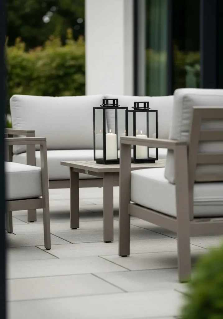 This modern patio setup brings Christmas style outdoors in the most elegant way. Sleek black lanterns with tall white candles sit on a neutral coffee table surrounded by soft cream cushions, giving a subtle festive touch without feeling overdone.