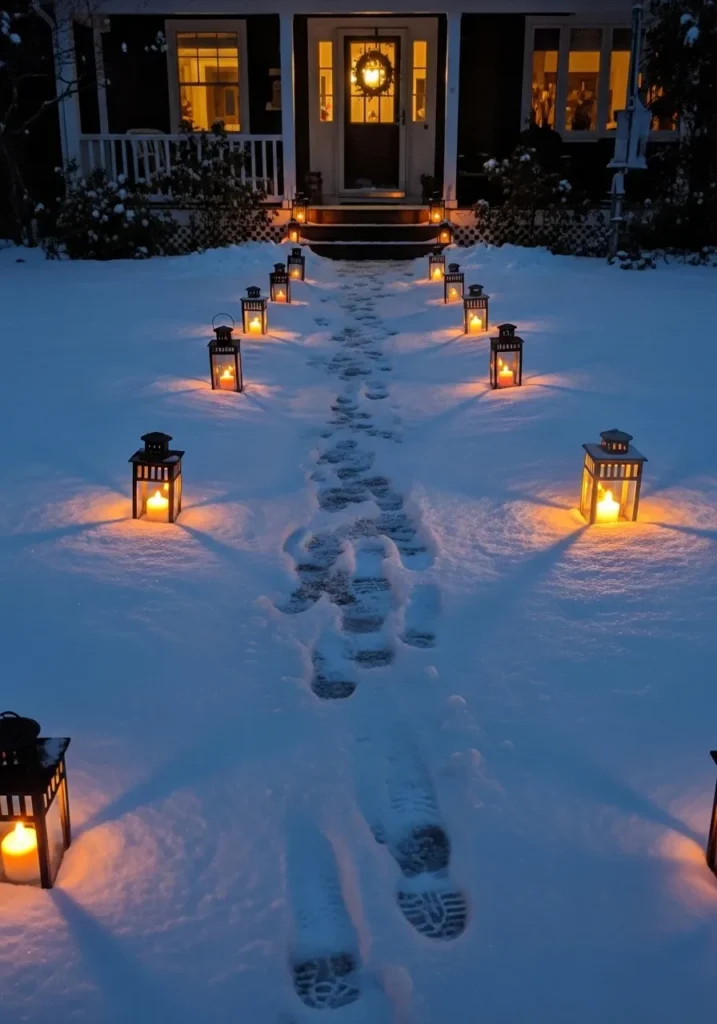 A snow-covered walkway lined with glowing lanterns guides the way to a warmly lit front porch. The footprints in the snow make it feel lived-in and inviting, like guests are just arriving for a cozy Christmas gathering.