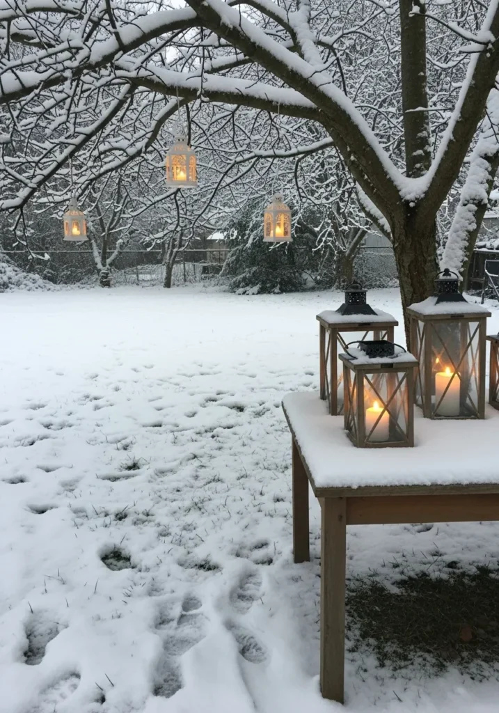 This snowy backyard scene looks like a dream. Lanterns sit on a wooden table while others hang gracefully from tree branches, each one glowing softly through the fresh white snow.
