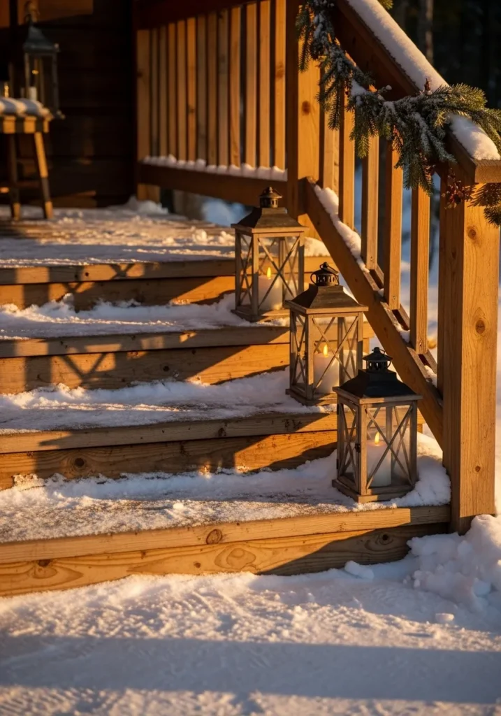 Wooden steps dusted with snow and lined with lanterns glowing at dusk—this is pure winter wonder. The natural wood railing wrapped with garland adds that nostalgic touch, while the light dances softly across the snow.