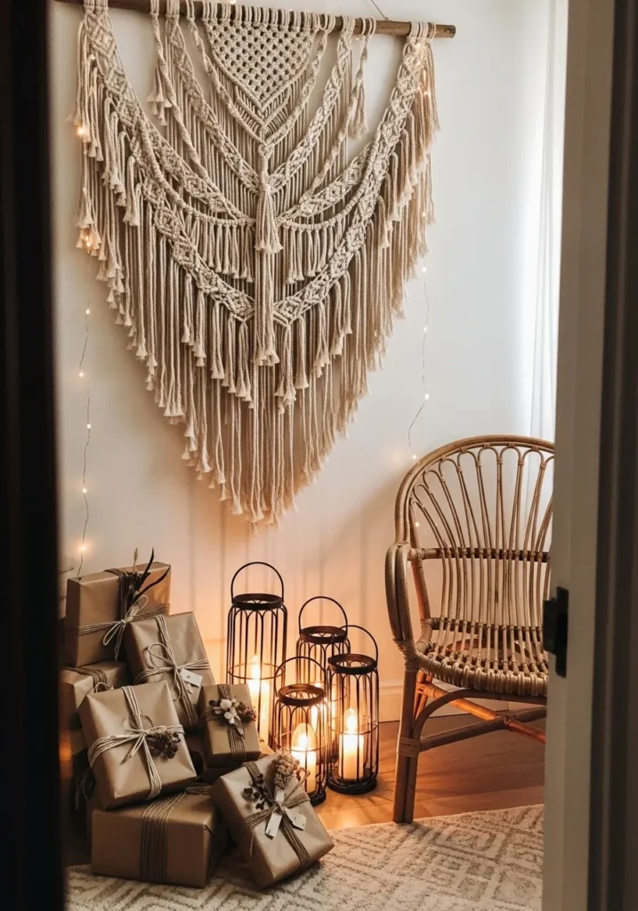 This cozy nook is full of texture and charm, with woven macramé, a rattan chair, and a little collection of glowing lanterns. The wrapped gifts in brown paper tie it all together for that earthy, bohemian holiday look.