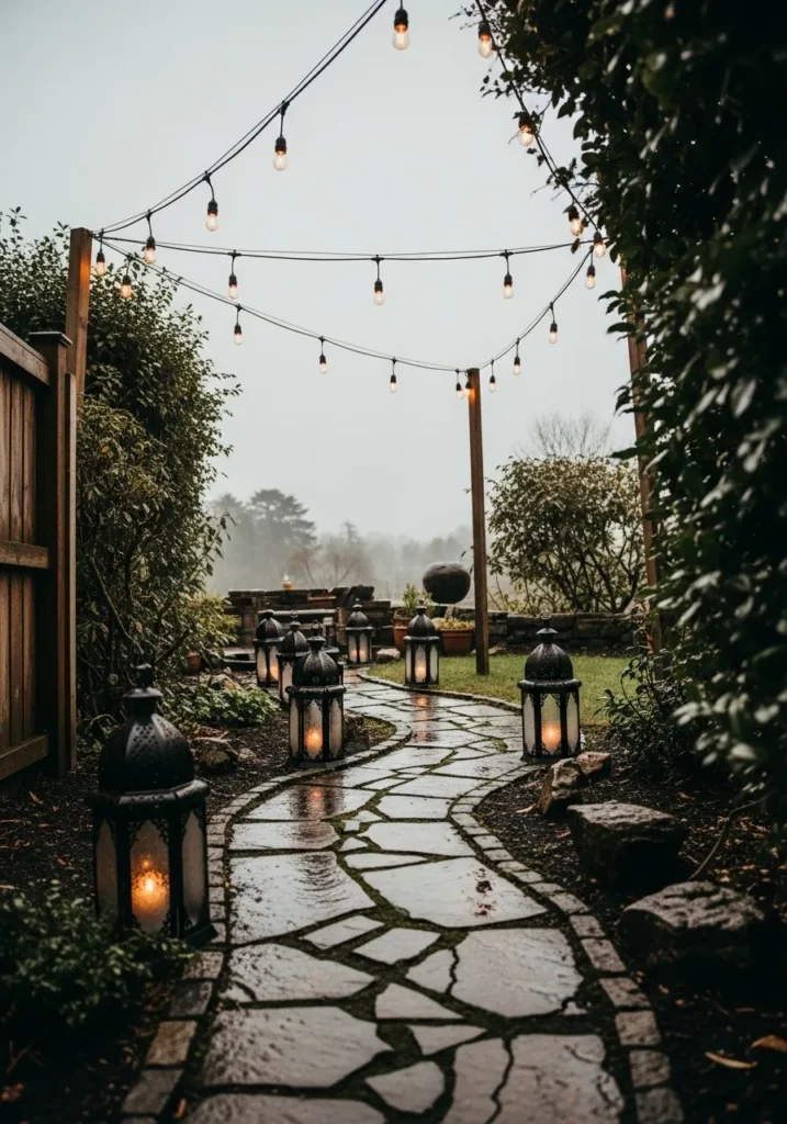 This charming garden walkway feels straight out of a holiday movie. The lanterns guide the path with soft candlelight while twinkling string lights above add a dreamy, festive sparkle. Even the wet stones glisten beautifully in the glow.
