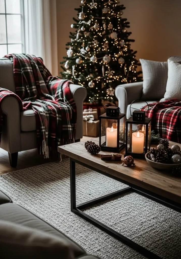 This room feels like a Christmas card come to life, with plaid blankets, twinkling tree lights, and black lanterns softly glowing on the coffee table. The mix of red, green, and gold makes it perfectly traditional yet effortlessly homey.