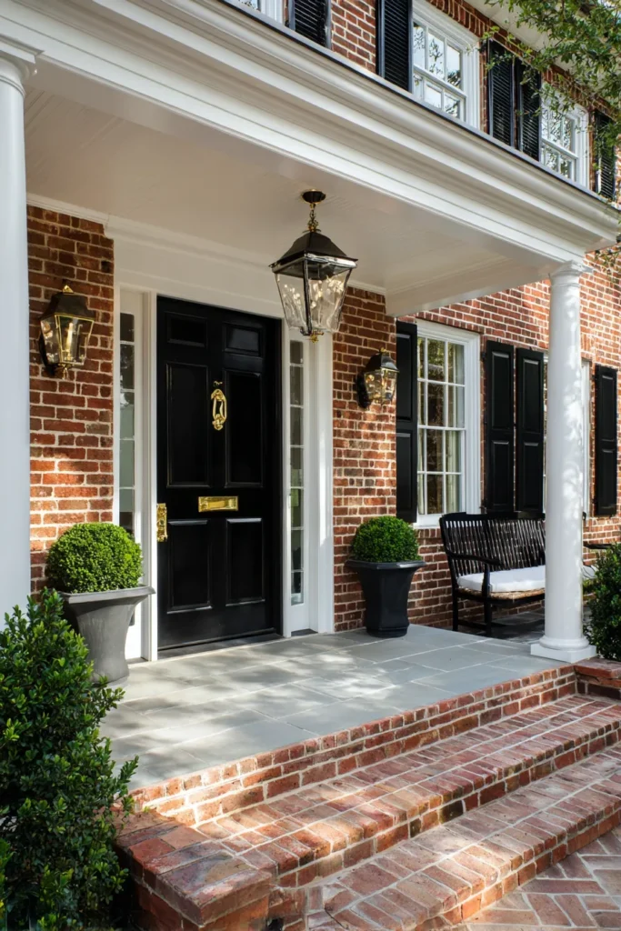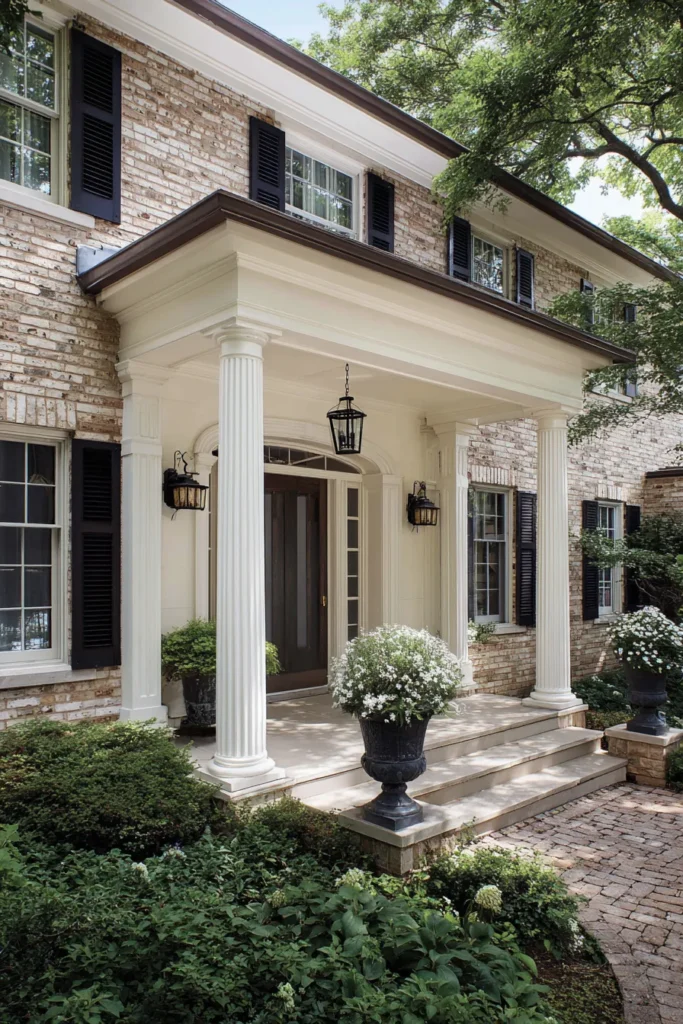 This porch leans into Georgian tradition with fluted white columns, brick exterior walls, and classic black shutters. The front door is understated, allowing the architectural details to shine. Symmetry and clean lines keep the whole design feeling refined and balanced.