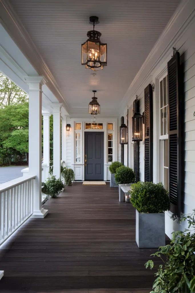 This long covered porch features evenly spaced lantern lighting that draws the eye toward the front door. White siding, black shutters, and dark wood flooring create a balanced contrast that feels timeless. Large planters and simple benches add warmth without cluttering the walkway.