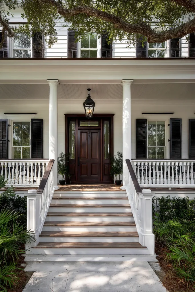 This porch showcases a beautiful wood front door framed by white columns and railings. The wide steps and balanced layout create a strong sense of symmetry, while soft landscaping keeps the look grounded. Lantern lighting adds warmth without stealing attention from the architecture.