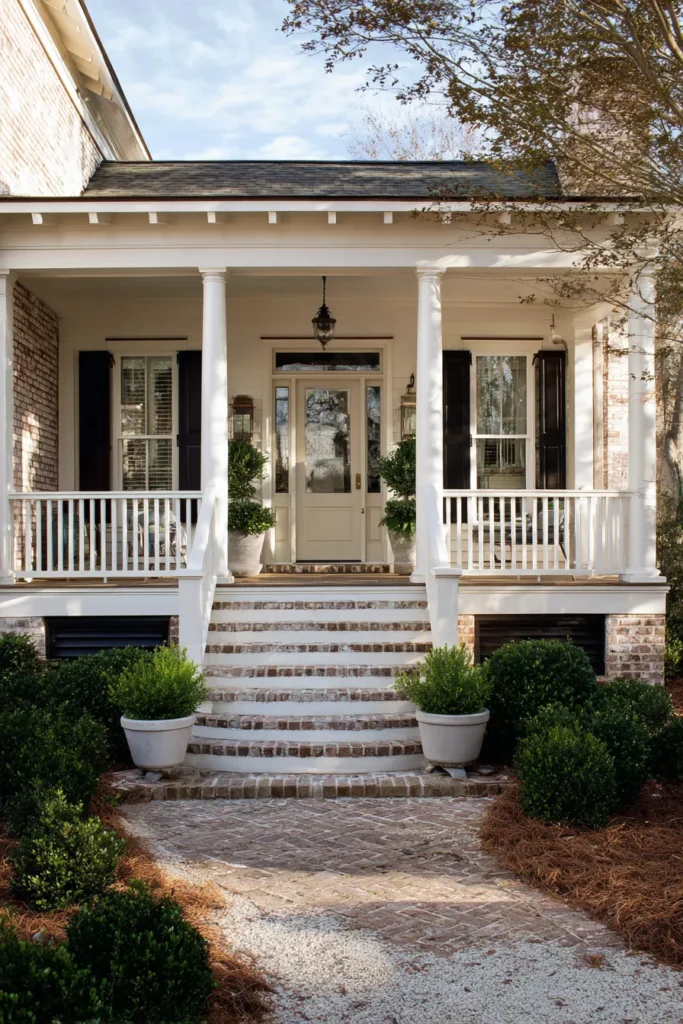 Classic Porch With Brick Steps And Soft Neutrals