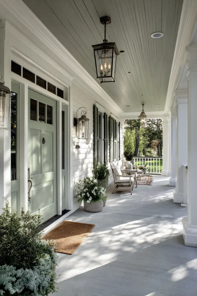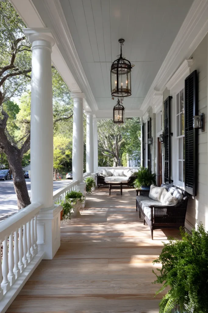 I love how calm and orderly this porch feels. The symmetry and lighting make it feel welcoming at any time of day, which is exactly what a classic porch should do.
