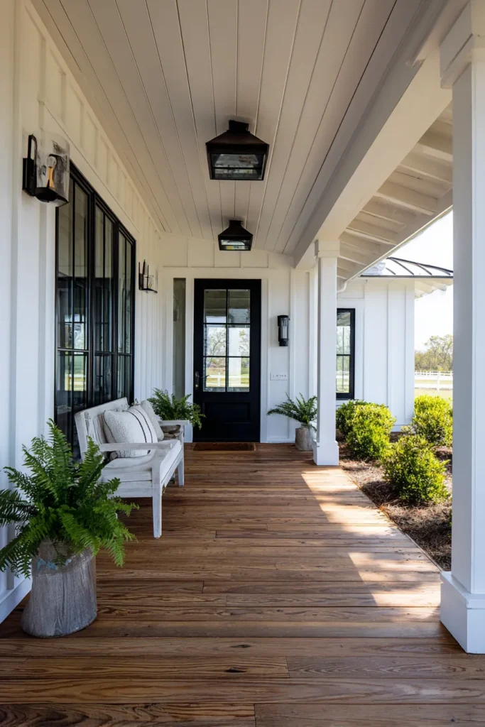 This porch blends farmhouse warmth with traditional structure through white columns, wood flooring, and simple lantern lighting. A bench and potted ferns add softness, while the dark door keeps the look rooted and balanced.