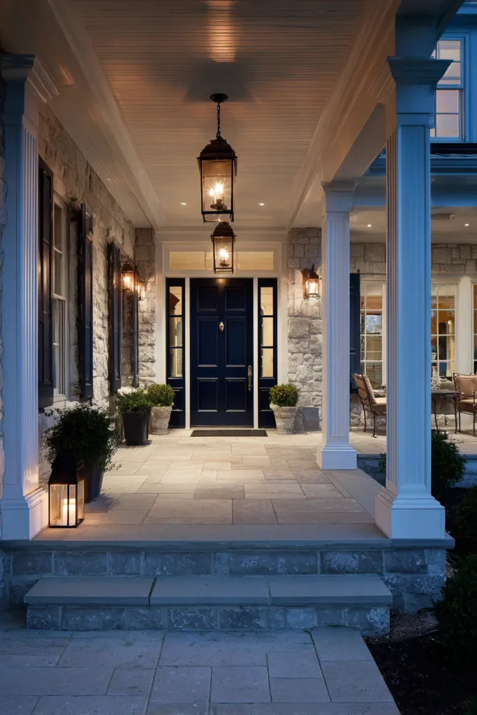 This porch truly shines at dusk, with warm lantern lighting reflecting off stone flooring and white columns. The dark front door anchors the space, while subtle greenery keeps it from feeling too formal. Everything feels calm and inviting.