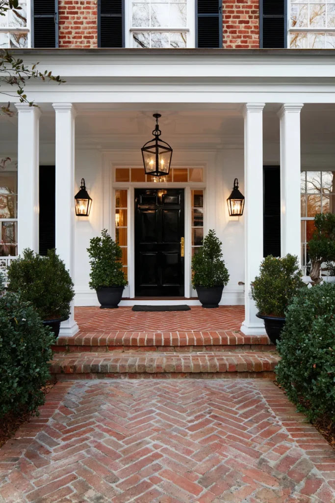 This front porch leans into classic colonial style with its balanced columns, crisp white trim, and rich red brick facade. The black front door feels bold yet timeless, especially paired with traditional lantern lighting and neatly shaped potted greenery that frames the entrance just right. Brick steps laid in a herringbone pattern add texture without feeling busy, keeping the whole look grounded and elegant.