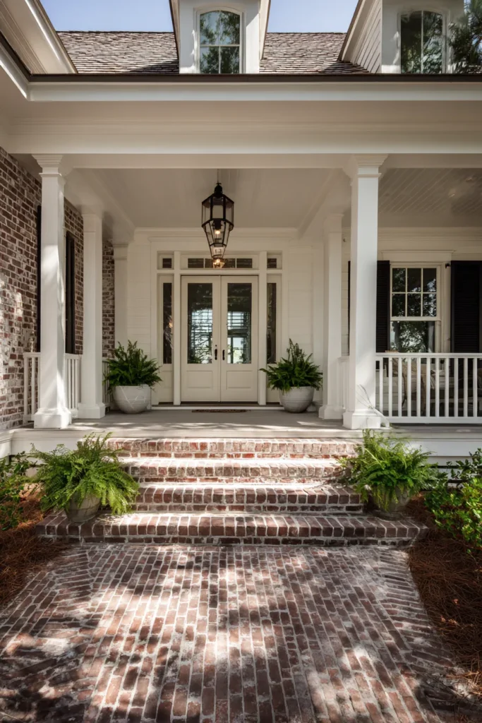 This front porch keeps things beautifully traditional with white columns, a clean railing, and a brick staircase that feels solid and timeless. The soft white double doors sit perfectly centered, framed by simple lantern lighting and matching potted greenery. Brick paving at the base adds texture while keeping the look grounded and classic.