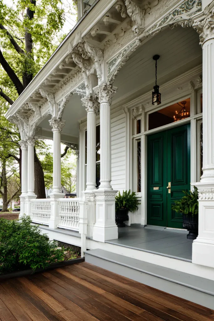 This porch stands out with its intricate trim details, decorative brackets, and tall fluted columns that instantly signal classic craftsmanship. The deep green double doors add richness and depth, while the white exterior keeps everything light and elegant. Traditional railings and soft porch flooring complete the look without overwhelming the details.