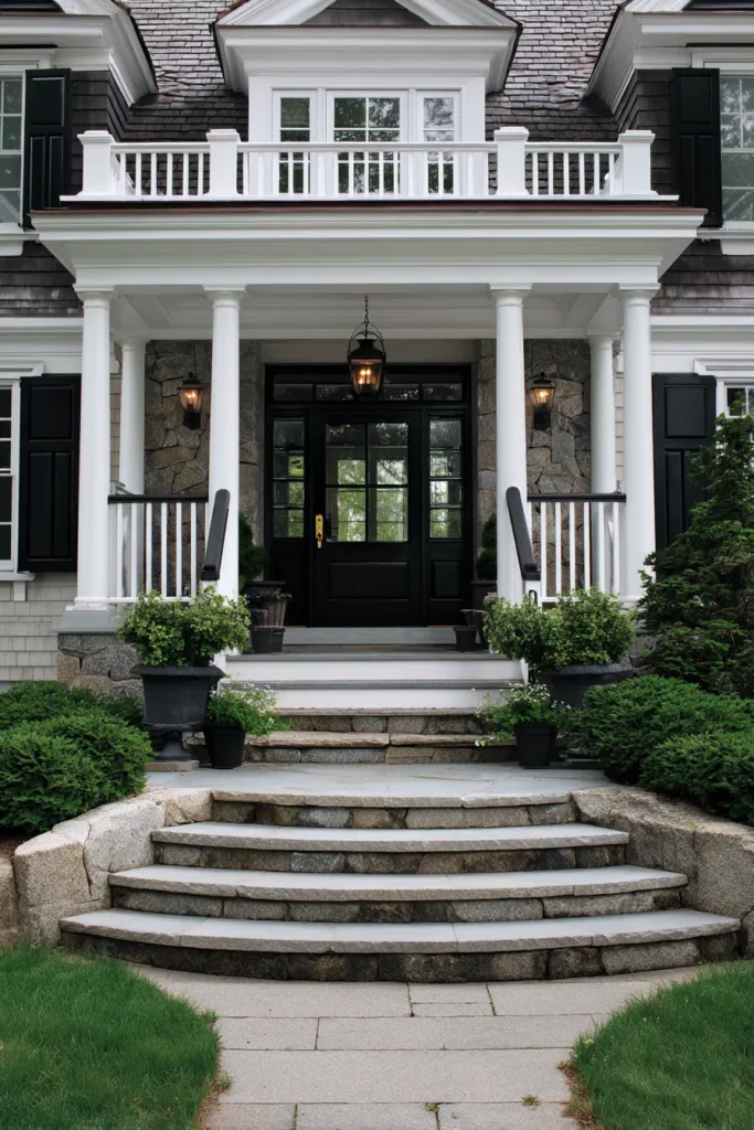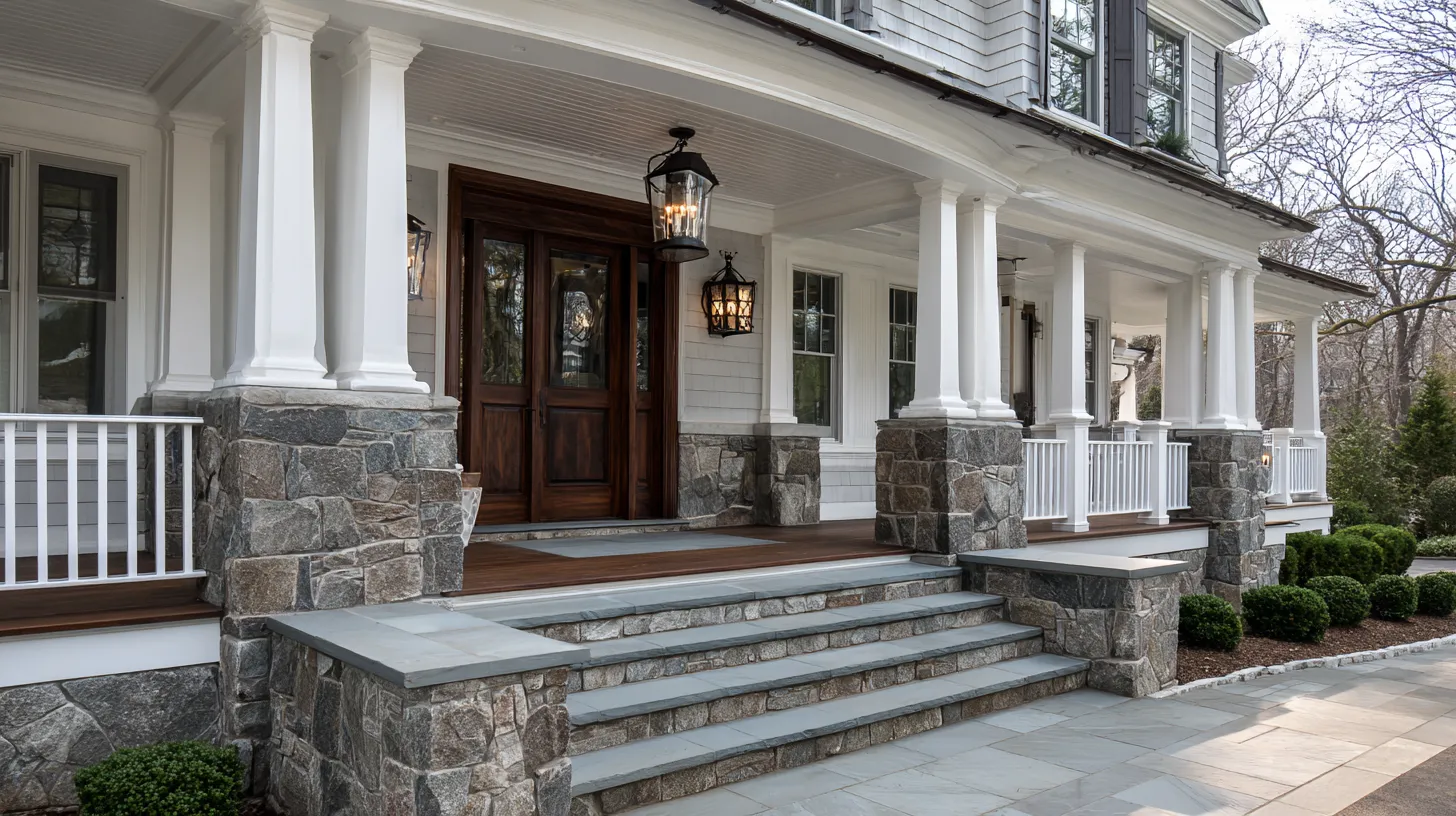This front porch makes a statement with its wide stone steps, sturdy columns, and dark front door framed by greenery. The stonework adds weight and permanence, while traditional lanterns soften the look with warm light. Everything feels solid and timeless.