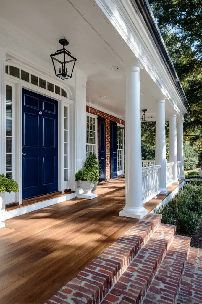 This long front porch stretches gracefully across the home, supported by classic white columns and finished with warm wood flooring. The deep navy front door adds just enough contrast against the brick exterior, while black shutters and simple lantern lights keep the look rooted in tradition. The railing details and brick steps feel refined but still approachable.