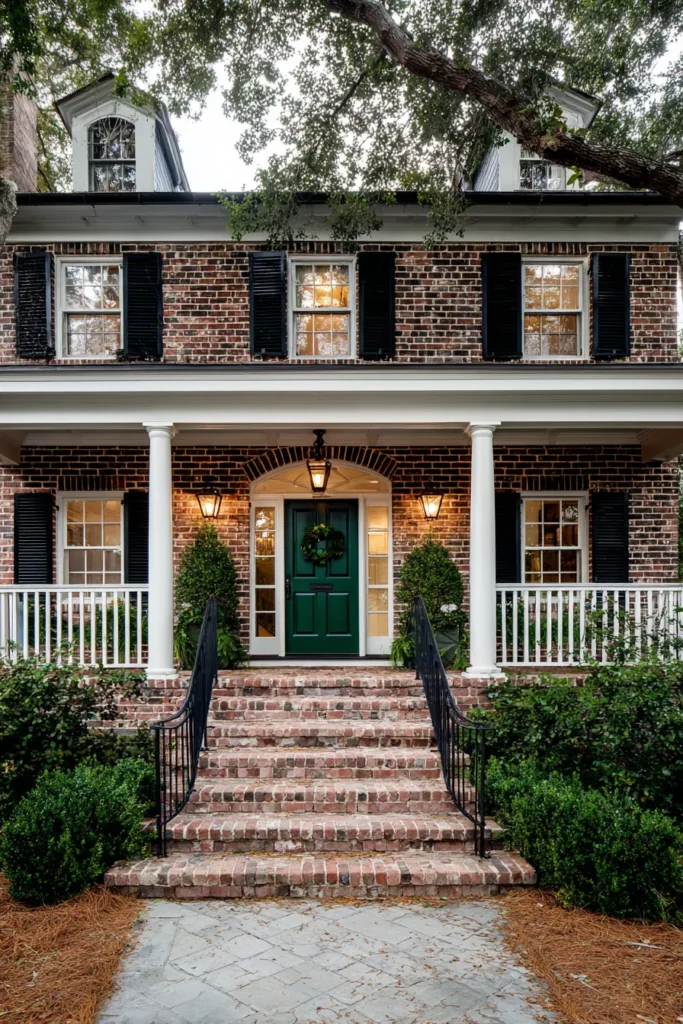 This porch highlights classic Federal style details with its brick exterior, evenly spaced windows, and simple white columns. The deep green front door adds a subtle pop of color that still feels very traditional, especially when paired with black shutters and warm lantern lighting. Brick steps and iron railings give the entrance a sturdy and elegant feel.
