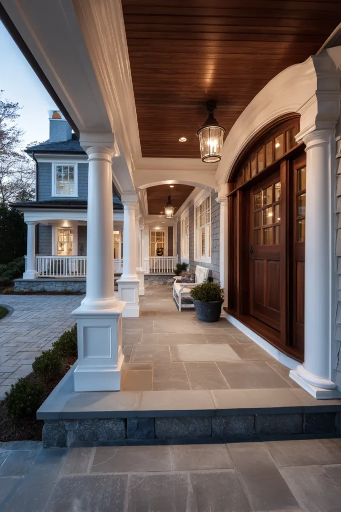 This porch blends classic structure with warm materials, featuring white columns, stone flooring, and a rich wood ceiling that adds depth. The arched doorway softens the look, while traditional lantern lighting keeps the design grounded in classic style. Every detail feels carefully chosen without feeling formal.