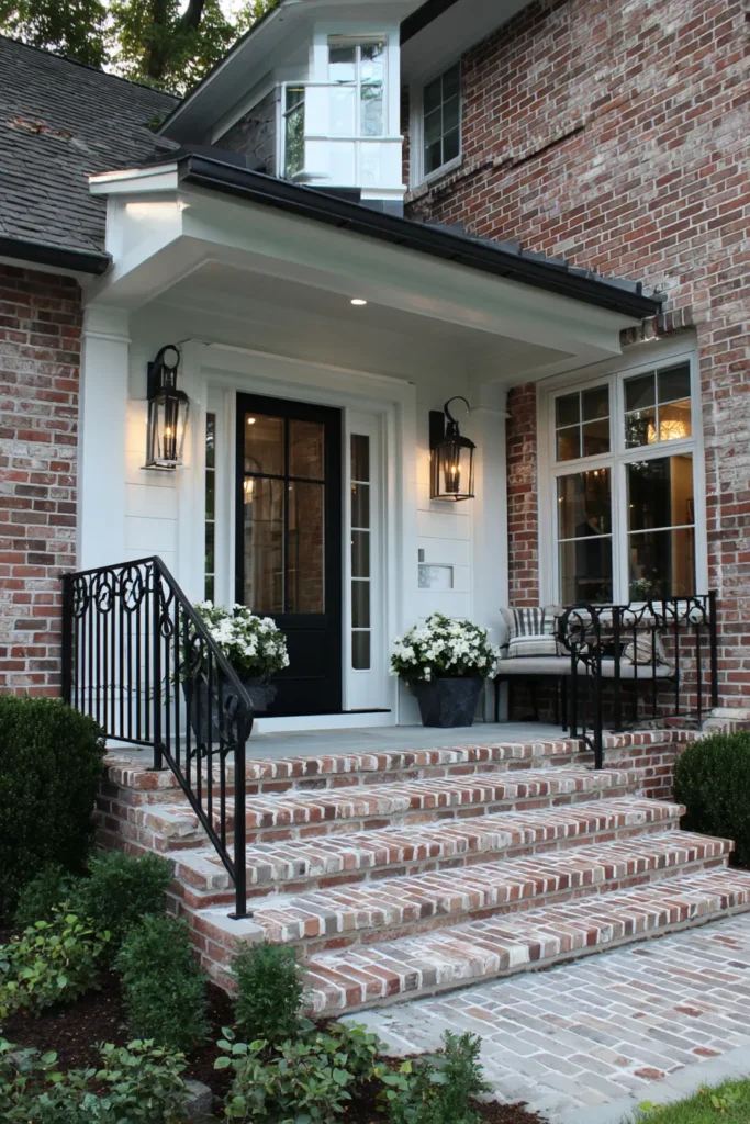 This smaller front porch proves that classic design works at any scale. Brick steps, black iron railings, and traditional lantern lights create a polished look, while the black front door keeps everything feeling timeless. Potted flowers and a small seating area add charm without clutter.