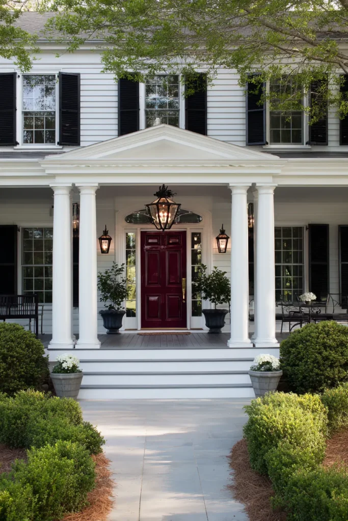 This porch stands out with its crisp white siding, stately columns, and a rich red front door that adds instant character. Symmetry plays a big role here, from the lighting placement to the planters flanking the steps. Everything feels balanced and intentional.