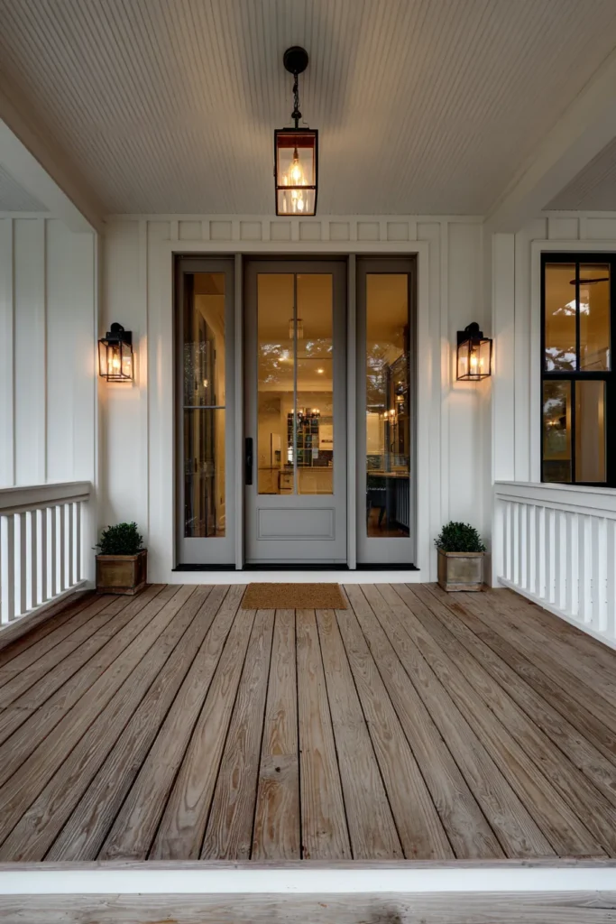 This porch focuses on clean lines and classic craftsmanship, featuring paneled double doors, white railings, and soft wood flooring. Lantern lighting and simple box planters keep the look refined without adding visual noise. The overall feel is calm and welcoming.