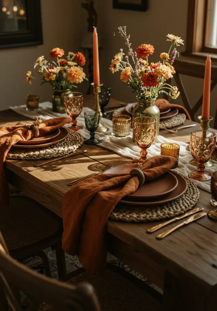 This warm rustic table setting embraces rich fall tones with burnt orange napkins, amber glassware, and golden flatware. The wooden table is topped with woven chargers, brass candleholders, and vases filled with marigolds and wildflowers. Everything feels layered and textured, bringing a cozy harvest mood to the room.