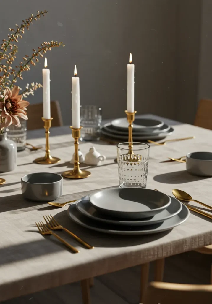This design blends modern simplicity with soft, welcoming touches. The table features muted gray dinnerware, gold utensils, and brass candlesticks holding white taper candles. A small bouquet of neutral-toned flowers adds just the right amount of warmth. The clean lines and gentle lighting create a modern yet comfortable Thanksgiving mood.