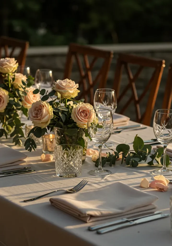 This elegant table feels delicate and refined, with blush roses and eucalyptus arranged in crystal vases along a soft linen runner. The sunlight glows through the glassware, giving everything a golden softness that feels both romantic and serene. Wooden chairs and white napkins keep the design grounded and timeless.