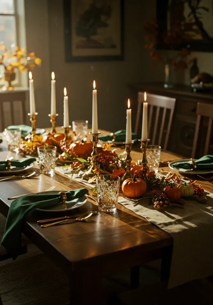 This table brings that perfect harvest warmth with its soft candlelight and golden afternoon glow. Small pumpkins, orange berries, and brass candlesticks line the center of a wooden table, creating a cozy and welcoming Thanksgiving atmosphere. Dark green napkins tied with gold napkin rings add a refined touch that complements the autumn palette beautifully.