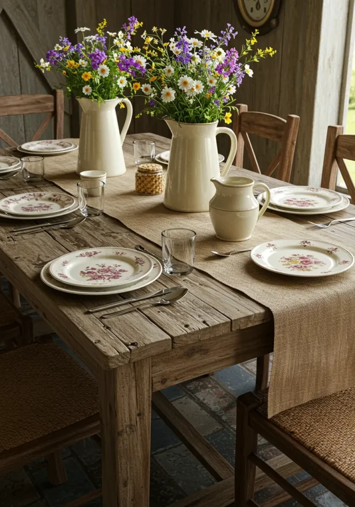 This table captures that laid-back countryside feel that makes Thanksgiving gatherings so homey. Rustic wood, floral China, and simple cream pitchers filled with wildflowers create a lovely balance of charm and comfort. The burlap runner ties everything together and brings that hint of farmhouse authenticity.